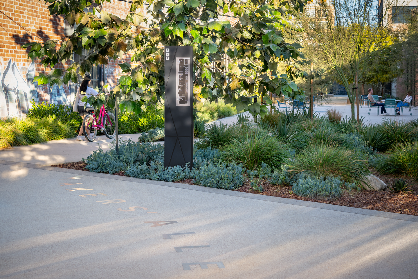 Black and white graphic treatments coupled with simple geometries unify the graphic approach across the comprehensive signage and wayfinding program. A pared down use of materials and neon reference the neighborhood’s recent industrial uses and urban setting. Site interpretive graphics pay homage to the nearby LA River, as well as 19th and early 20th century history of the neighborhood such as the former passage of the Southern Pacific and Santa Fe railroads right through the paseo.