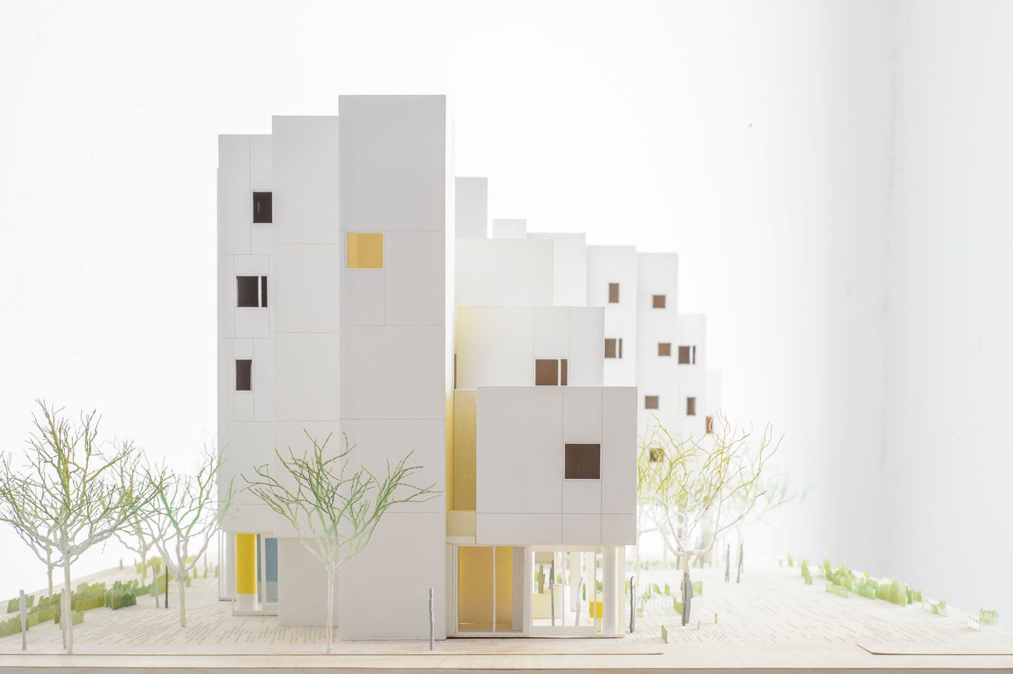For this project, I headed model landscape representation and hand crafted 18 custom trees and a morphing grass graphic to mimic the flow of wind and light within Michael Maltzan‘s Crest Apartments. Each tree was wire formed, gesso dipped, then hand painted to resemble the actual species of trees at Crest. The “grass” in the model was a 2D field of lines in shades of green. The apartment itself was made of laser-cut acrylic panels emphasizing the building’s control joints used to mitigate cracking on the exterior.