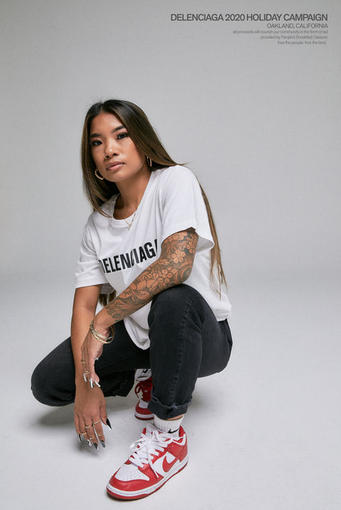 Delenciaga is a clothing brand direct from the mind of Delency Parham, and its sales are a way to collect resources for Oaklands unhoused and underserved communities. All proceeds from this campaign went towards People's Program, a Black-led organization, founded by Black youth in 2017, dedicated to empowering the community of Oakland through grassroots community programs. Instead of relying on top-down solutions, they champion bottom-up approaches to address the core issues affecting their community. Their mission is clear: To serve the people, build autonomy, and directly impact Black lives.